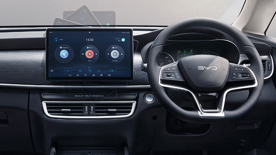 Nội thất BYD M6 ấn tượng với những đường nét năng động cùng không gian rộng rãi, ghế ngồi thiết kế thoải mái. Khu vực điều khiển trung tâm nổi bật với cần số điện tử gọn gàng; màn hình trung tâm đặc trưng của BYD với khả năng xoay thông minh, kích thước 12,8 inch, hỗ trợ kết nối Apple CarPlay/Android Auto không dây, tích hợp camera 360 độ với tính năng nhìn xuyên gầm. Người dùng dễ dàng thực hiện các thao tác như lên/xuống kính, điều chỉnh điều hòa… thông qua tính năng ra lệnh bằng giọng nói, mang đến sự linh hoạt và an toàn khi điều khiển xe. Hàng ghế thứ 2 trên BYD M6 có thể điều chỉnh trượt tiến/lùi 270 mm, độ ngả lưng ghế mở rộng lên đến 1100. Đặc biệt, đây là mẫu MPV duy nhất trong phân khúc sở hữu hàng ghế thứ 3 có thể điều chỉnh độ ngả lưng, tăng trải nghiệm thoải mái cho người ngồi. Bên cạnh đó, BYD M6 là mẫu xe hiếm hoi trong phân khúc bố trí cửa gió điều hòa ở tất cả hàng ghế.