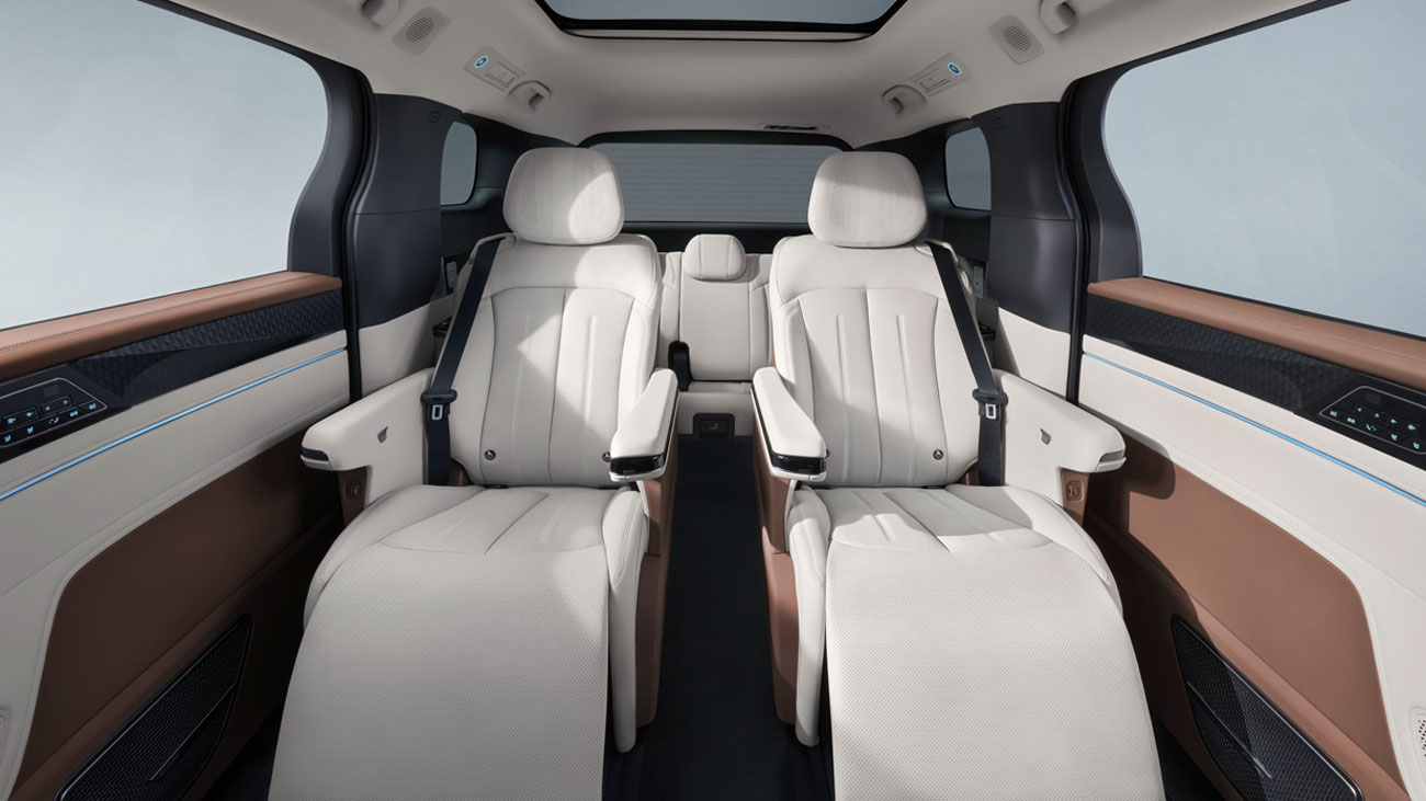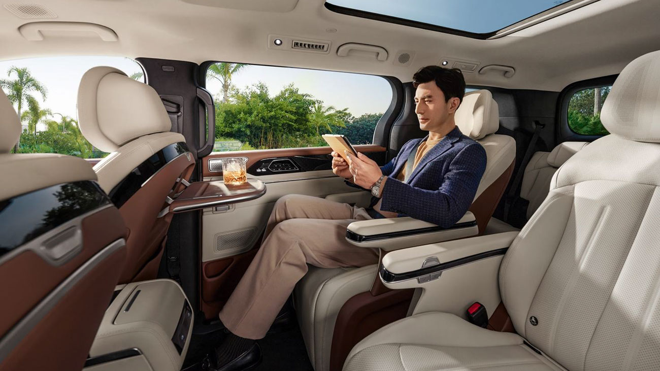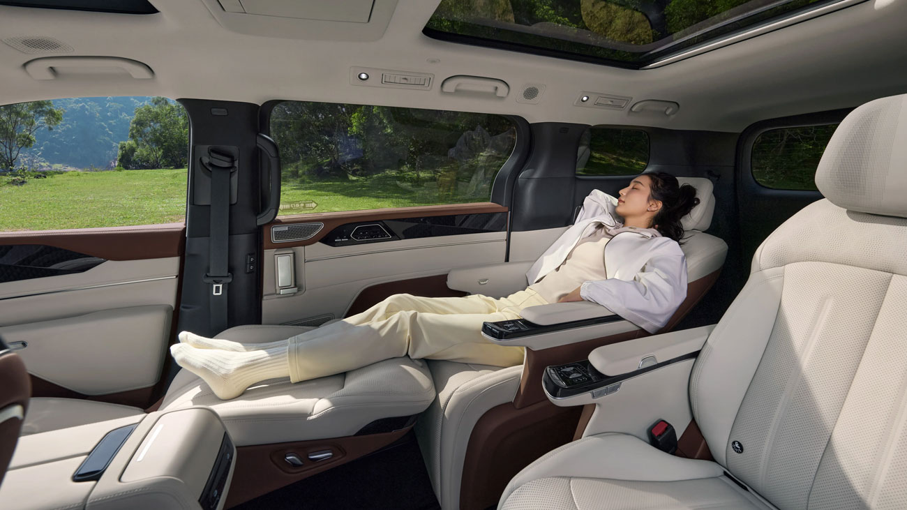 Ghế ngồi đều được bọc da cao cấp với thiết kế công thái học, tích hợp đầy đủ tính năng làm mát, massage đa điểm, mang đến trải nghiệm thoải mái ở mọi hành trình. Đặc biệt, hàng ghế giữa được ví như “ghế thương gia hạng nhất trên không”, với ghế ngồi khả năng điều chỉnh điện 4 hướng tích hợp nhớ vị trí, điều chỉnh bệ đỡ chân, hệ thống đệm linh hoạt cùng tính năng massage 10 điểm, bàn gấp tiện dụng giúp hành khách tận hưởng sự êm ái vượt trội